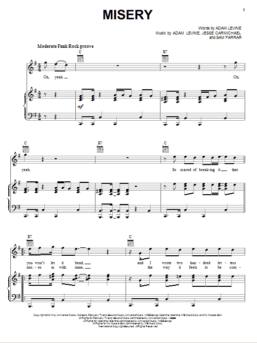 Download or print Maroon 5 Misery sheet music, chords and digital score arranged for Guitar Tab. This Pop score includes 8 page(s).
