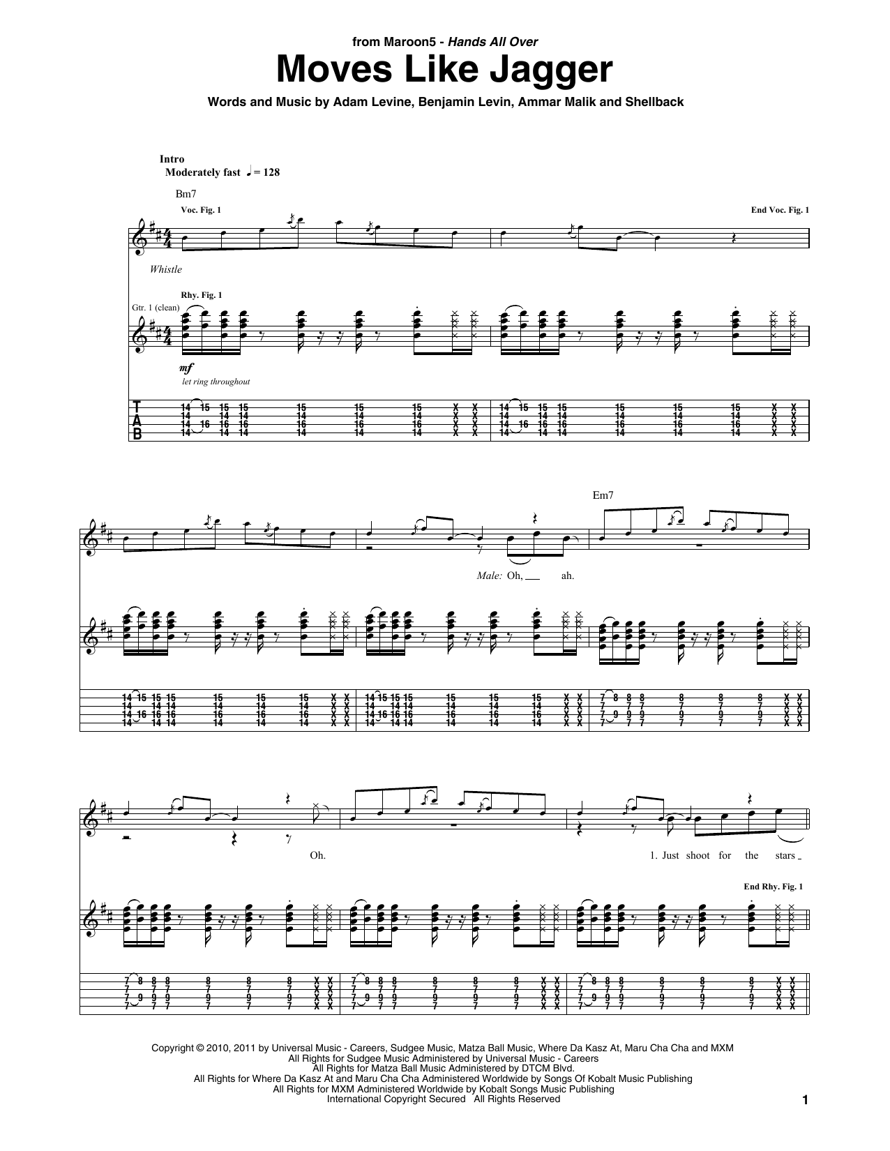 Download or print Maroon 5 Moves Like Jagger (feat. Christina Aguilera) sheet music, chords and digital score arranged for Guitar Tab. This Pop score includes 6 page(s).