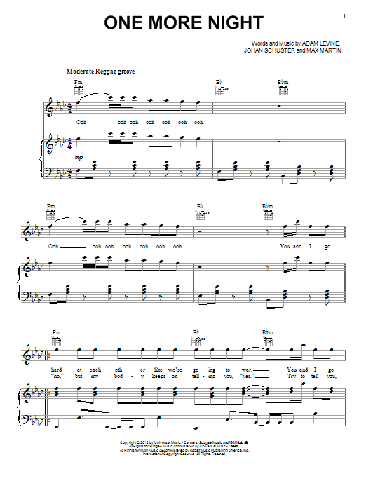 Download or print Maroon 5 One More Night sheet music, chords and digital score arranged for Guitar Chords/Lyrics. This Rock score includes 4 page(s).