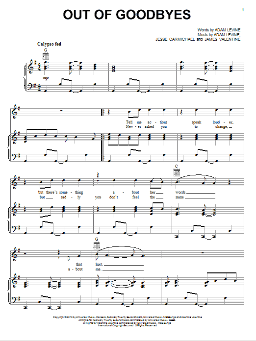 Download or print Maroon 5 Out Of Goodbyes sheet music, chords and digital score arranged for Piano, Vocal & Guitar Chords (Right-Hand Melody). This Pop score includes 4 page(s).