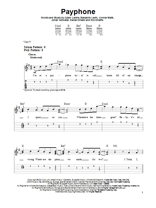 Download or print Maroon 5 Payphone sheet music, chords and digital score arranged for Easy Guitar Tab. This Pop score includes 4 page(s).