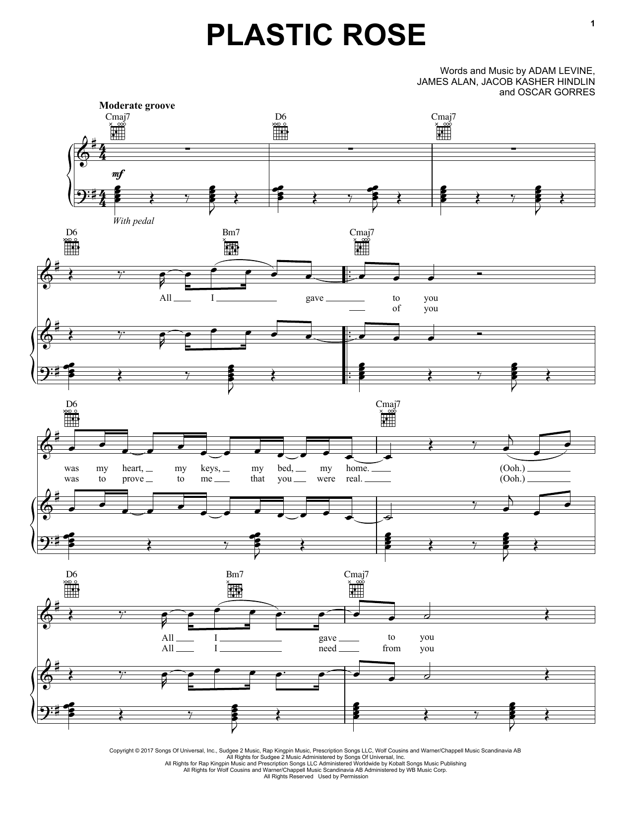 Download or print Maroon 5 Plastic Rose sheet music, chords and digital score arranged for Piano, Vocal & Guitar Chords (Right-Hand Melody). This Pop score includes 6 page(s).