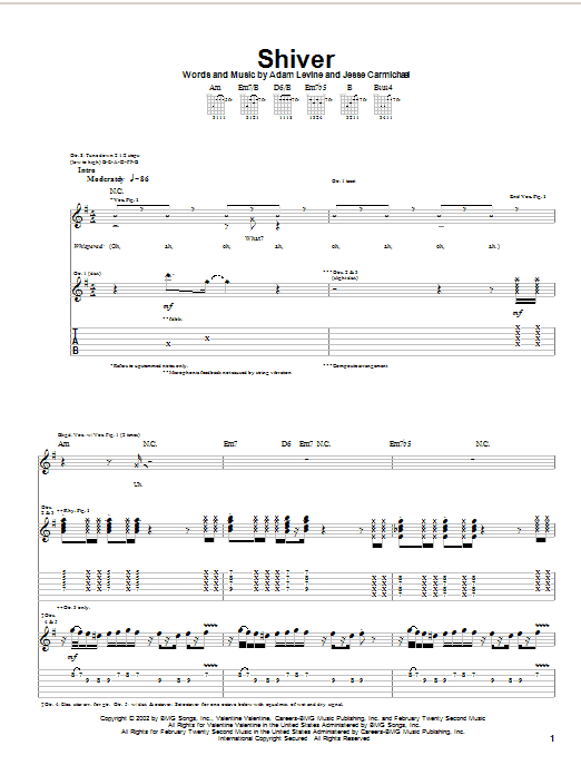 Download or print Maroon 5 Shiver sheet music, chords and digital score arranged for Lead Sheet / Fake Book. This Pop score includes 3 page(s).