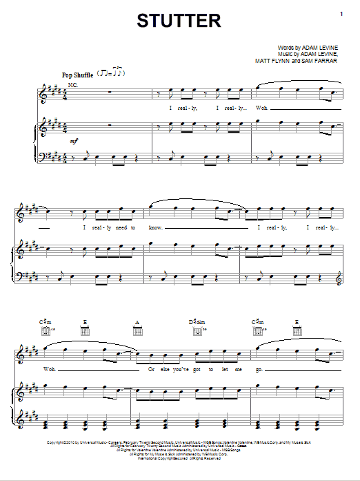 Download or print Maroon 5 Stutter sheet music, chords and digital score arranged for Piano, Vocal & Guitar Chords (Right-Hand Melody). This Pop score includes 7 page(s).
