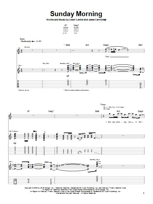 Download or print Maroon 5 Sunday Morning sheet music, chords and digital score arranged for Piano, Vocal & Guitar Chords (Right-Hand Melody). This Pop score includes 6 page(s).