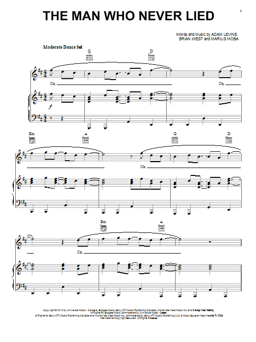 Download or print Maroon 5 The Man Who Never Lied sheet music, chords and digital score arranged for Piano, Vocal & Guitar Chords (Right-Hand Melody). This Pop score includes 7 page(s).