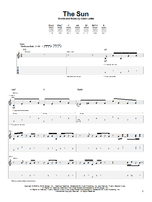 Download or print Maroon 5 The Sun sheet music, chords and digital score arranged for Guitar Tab. This Rock score includes 11 page(s).