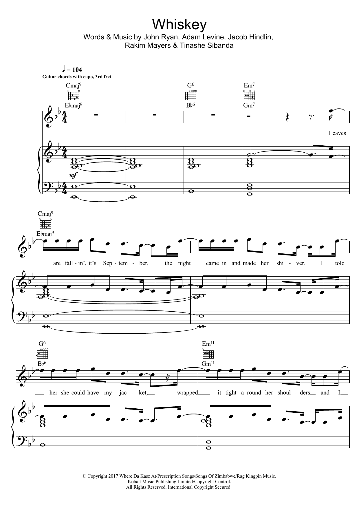 Download or print Maroon 5 Whiskey (featuring A$AP Rocky) sheet music, chords and digital score arranged for Piano, Vocal & Guitar Chords. This Pop score includes 10 page(s).