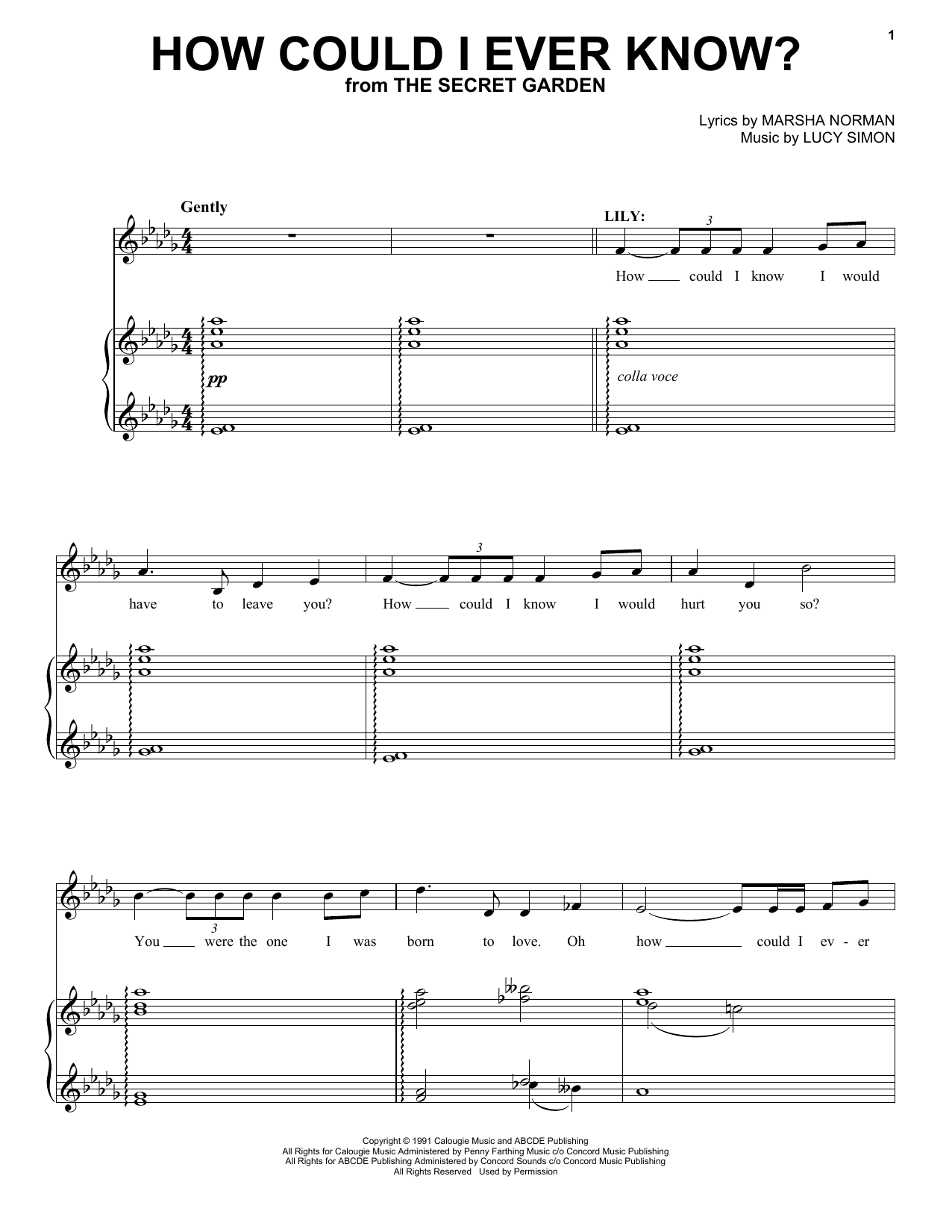 Download or print Marsha Norman & Lucy Simon How Could I Ever Know? sheet music, chords and digital score arranged for Piano & Vocal. This Musical/Show score includes 4 page(s).