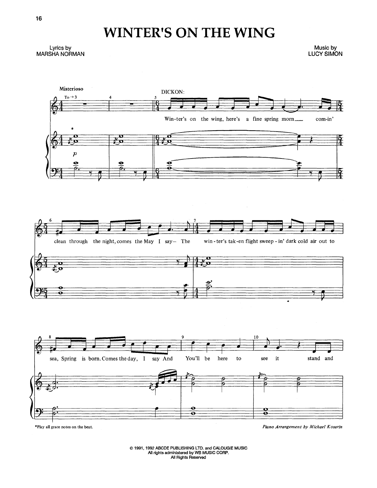 Download or print Marsha Norman & Lucy Simon Winter's On The Wing sheet music, chords and digital score arranged for Piano & Vocal. This Musical/Show score includes 6 page(s).