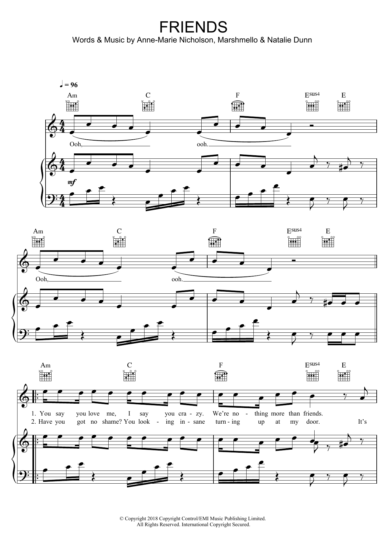 Download or print Marshmello & Anne-Marie FRIENDS sheet music, chords and digital score arranged for Easy Piano. This Pop score includes 4 page(s).