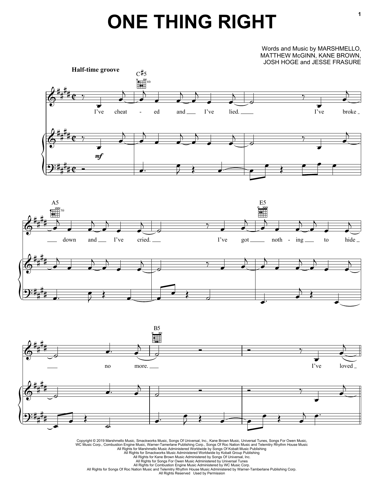 Download or print Marshmello & Kane Brown One Thing Right sheet music, chords and digital score arranged for Piano, Vocal & Guitar Chords (Right-Hand Melody). This Pop score includes 6 page(s).