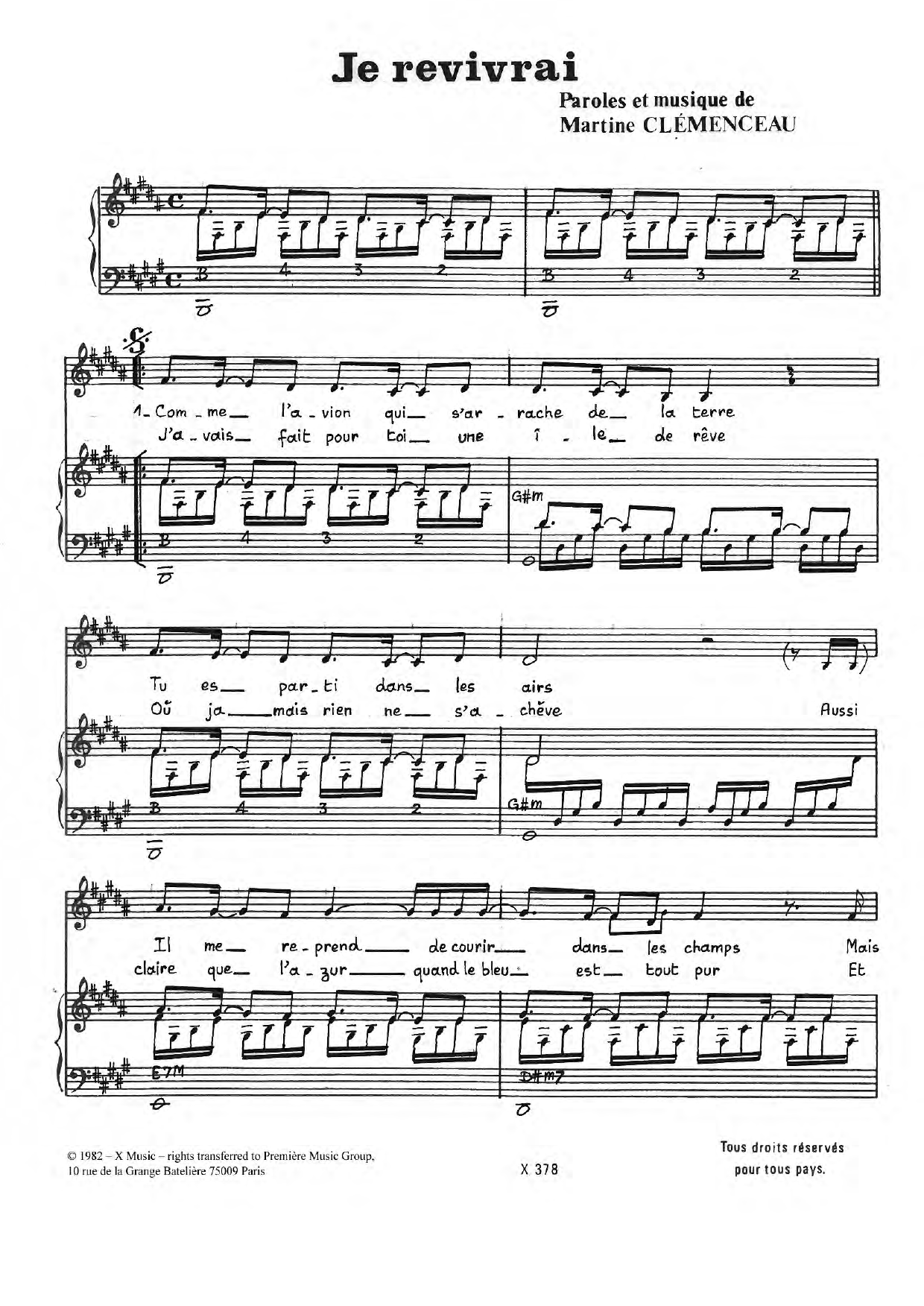 Download or print Martine Clemenceau Je Revivrai sheet music, chords and digital score arranged for Piano & Vocal. This Pop score includes 3 page(s).