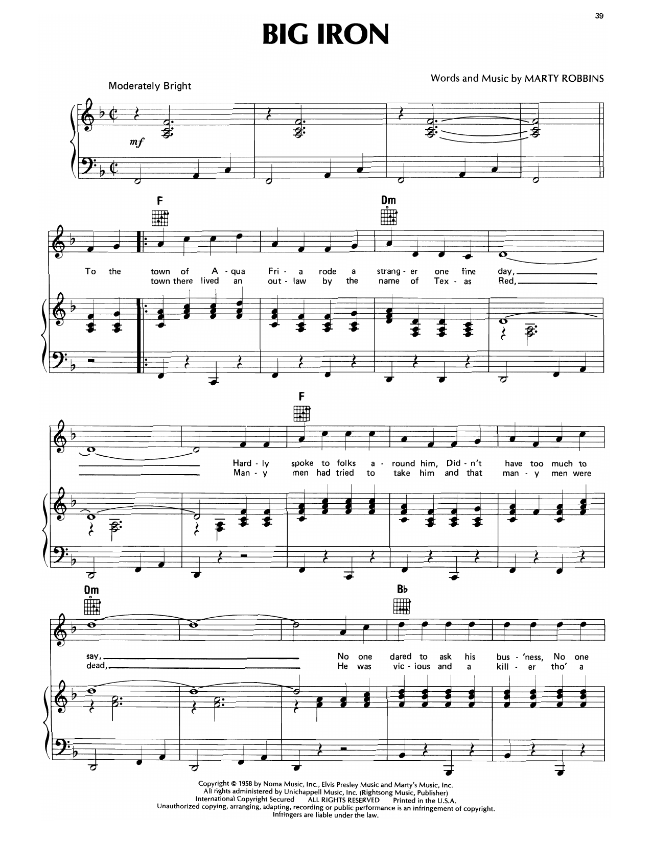 Download or print Marty Robbins Big Iron sheet music, chords and digital score arranged for Piano, Vocal & Guitar Chords (Right-Hand Melody). This Country score includes 3 page(s).