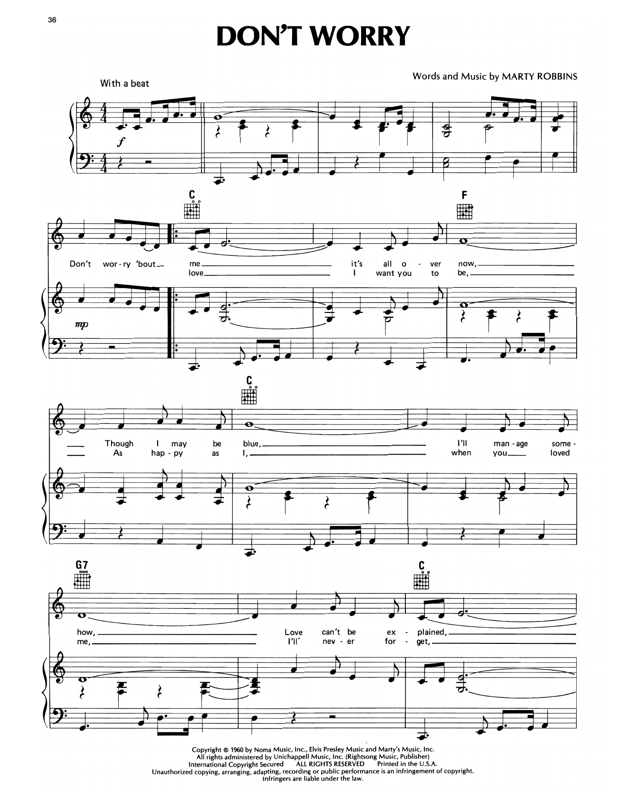 Download or print Marty Robbins Don't Worry sheet music, chords and digital score arranged for Piano, Vocal & Guitar Chords (Right-Hand Melody). This Country score includes 3 page(s).