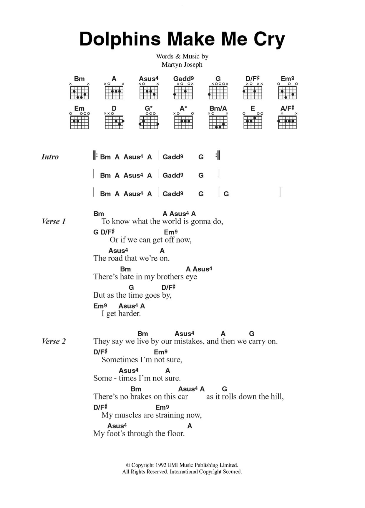 Download or print Martyn Joseph Dolphins Make Me Cry sheet music, chords and digital score arranged for Guitar Chords/Lyrics. This Pop score includes 3 page(s).