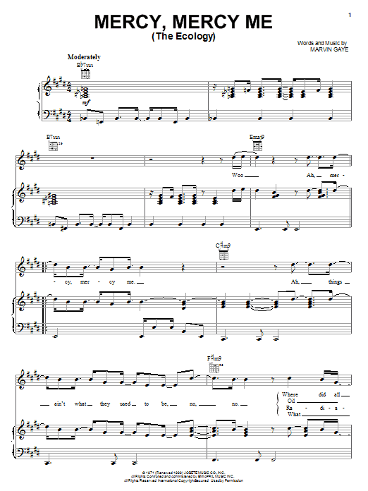 Download or print Marvin Gaye Mercy, Mercy Me (The Ecology) sheet music, chords and digital score arranged for Piano, Vocal & Guitar Chords (Right-Hand Melody). This Pop score includes 5 page(s).