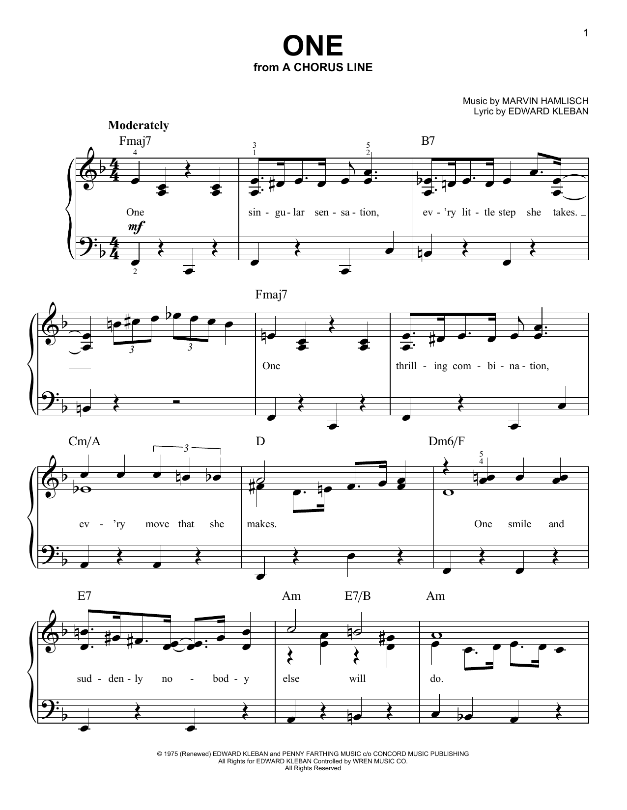 Download or print Marvin Hamlisch One sheet music, chords and digital score arranged for Easy Piano. This Jazz score includes 4 page(s).