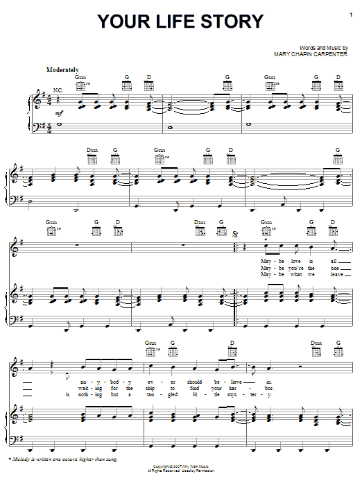 Download or print Mary Chapin Carpenter Your Life Story sheet music, chords and digital score arranged for Piano, Vocal & Guitar Chords (Right-Hand Melody). This Country score includes 6 page(s).
