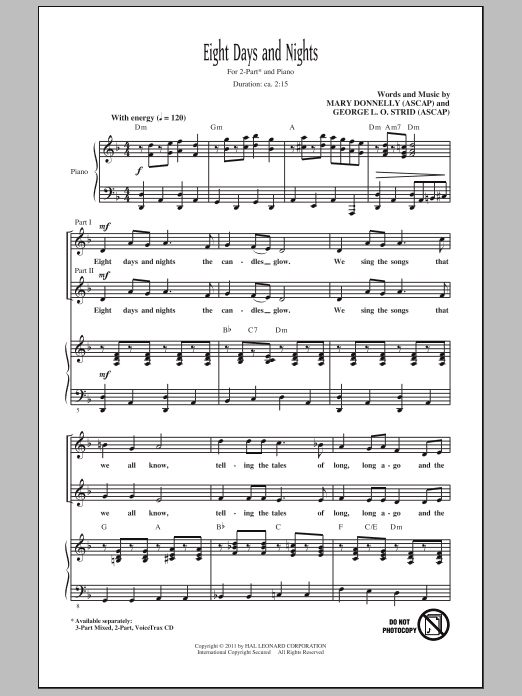 Download or print Mary Donnelly Eight Days And Nights sheet music, chords and digital score arranged for 3-Part Mixed Choir. This Holiday score includes 11 page(s).