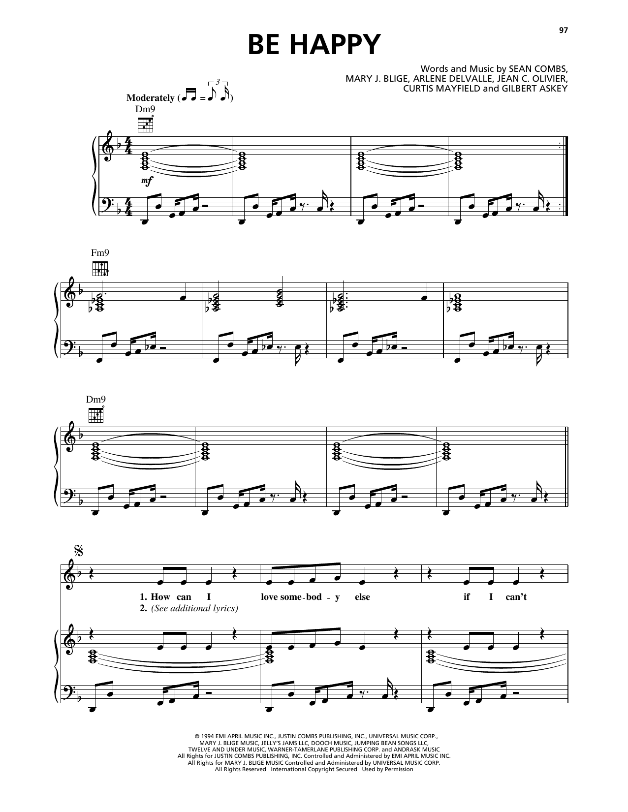 Download or print Mary J. Blige Be Happy sheet music, chords and digital score arranged for Piano, Vocal & Guitar Chords (Right-Hand Melody). This Pop score includes 7 page(s).