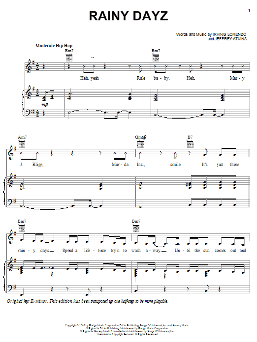 Download or print Mary J. Blige Featuring Ja Rule Rainy Dayz sheet music, chords and digital score arranged for Piano, Vocal & Guitar Chords (Right-Hand Melody). This Hip-Hop score includes 11 page(s).