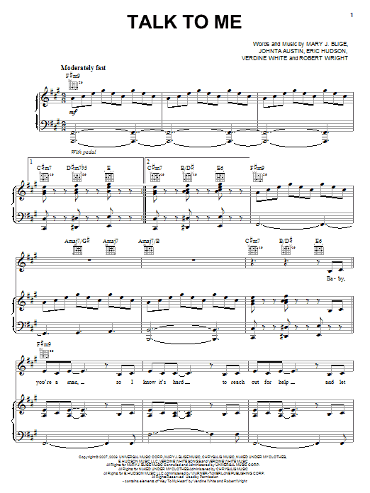 Download or print Mary J. Blige Talk To Me sheet music, chords and digital score arranged for Piano, Vocal & Guitar Chords (Right-Hand Melody). This Pop score includes 8 page(s).