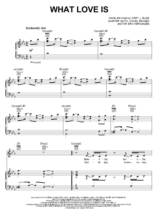 Download or print Mary J. Blige What Love Is sheet music, chords and digital score arranged for Piano, Vocal & Guitar Chords (Right-Hand Melody). This Pop score includes 7 page(s).