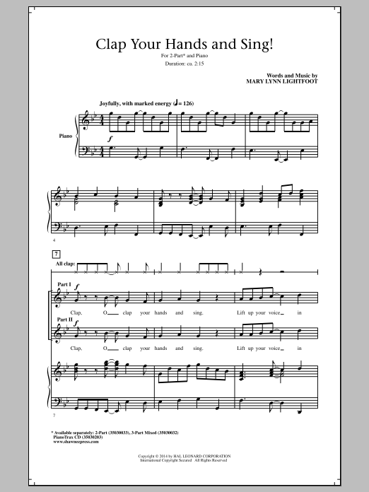 Download or print Mary Lynn Lightfoot Clap Your Hands And Sing! sheet music, chords and digital score arranged for 3-Part Mixed Choir. This Concert score includes 10 page(s).