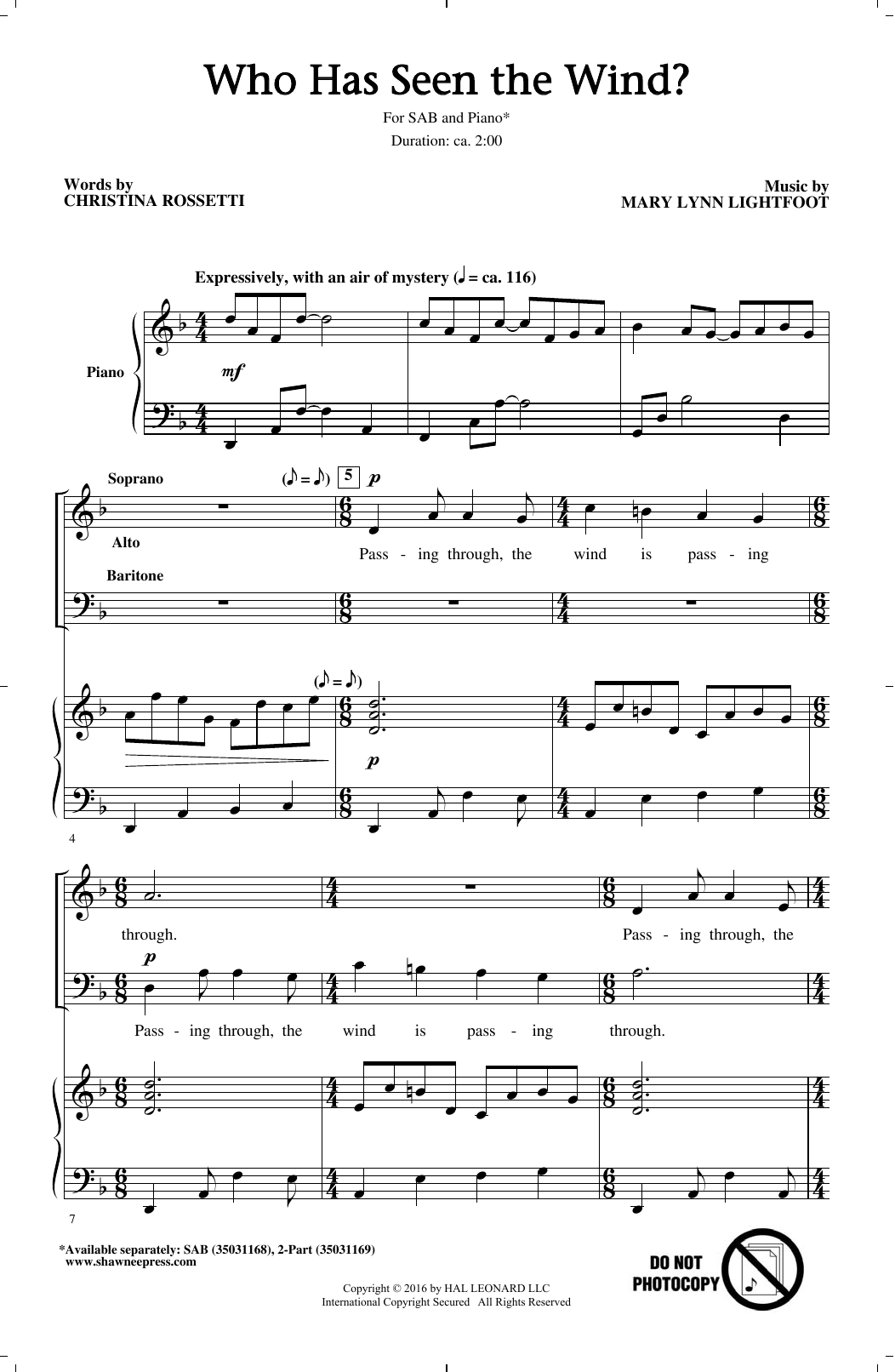 Download or print Mary Lynn Lightfoot Who Has Seen The Wind? sheet music, chords and digital score arranged for 2-Part Choir. This Pop score includes 6 page(s).
