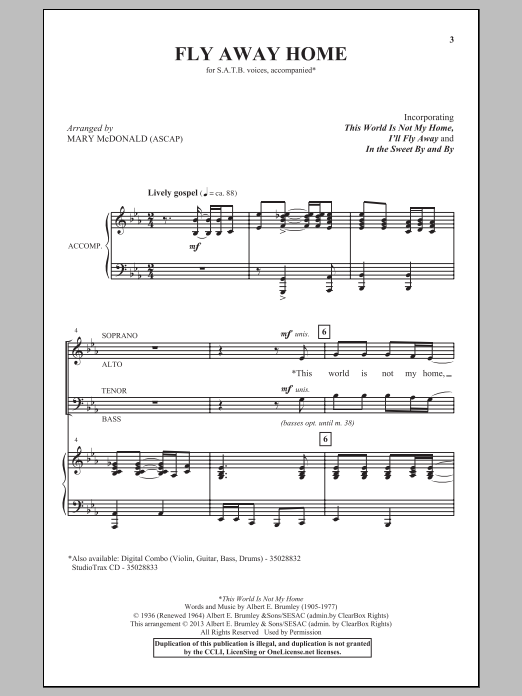 Download or print Mary McDonald Fly Away Home sheet music, chords and digital score arranged for SATB Choir. This Traditional score includes 3 page(s).