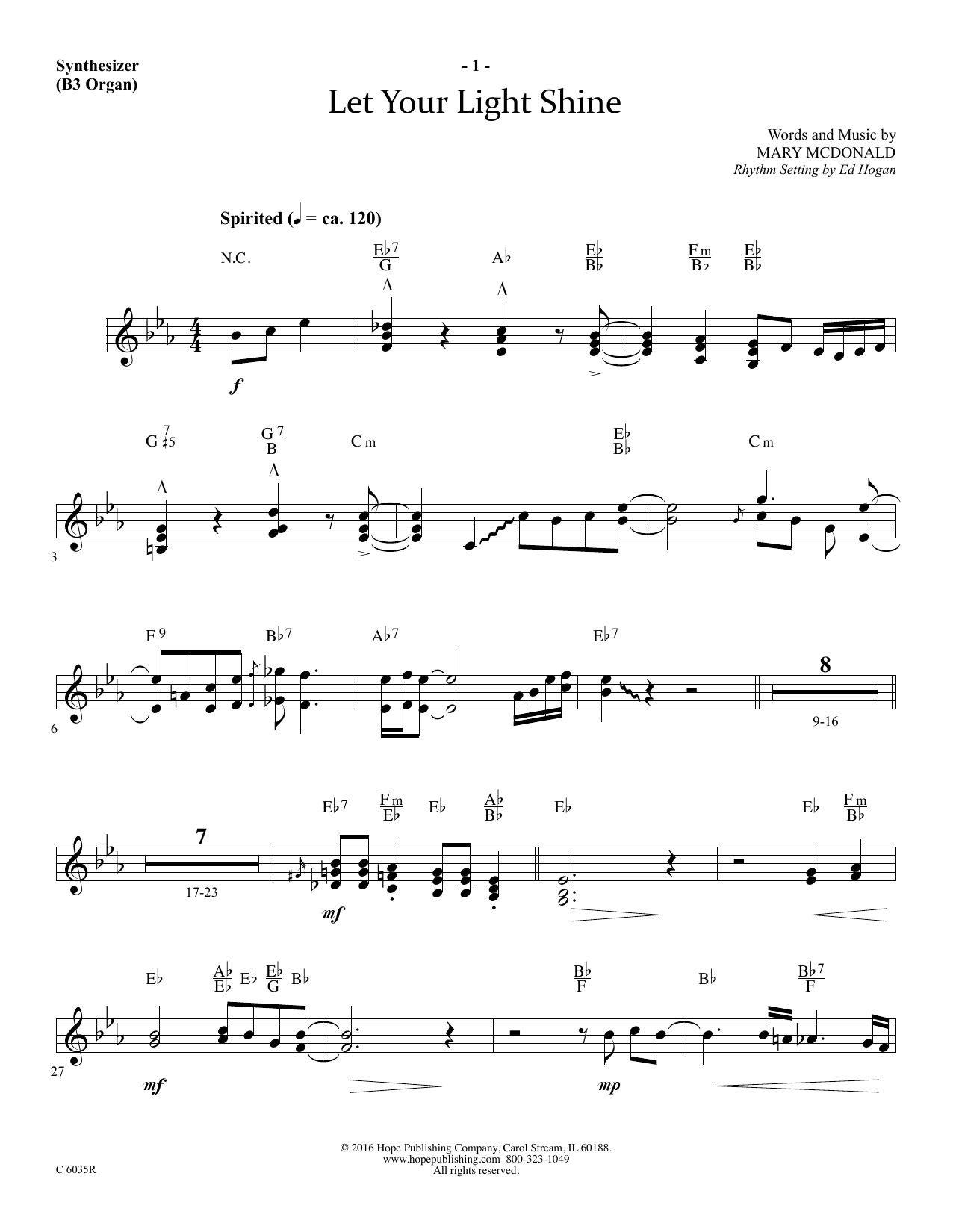 Download or print Mary McDonald Let Your Light Shine - Synthesizer sheet music, chords and digital score arranged for Choir Instrumental Pak. This Gospel score includes 3 page(s).