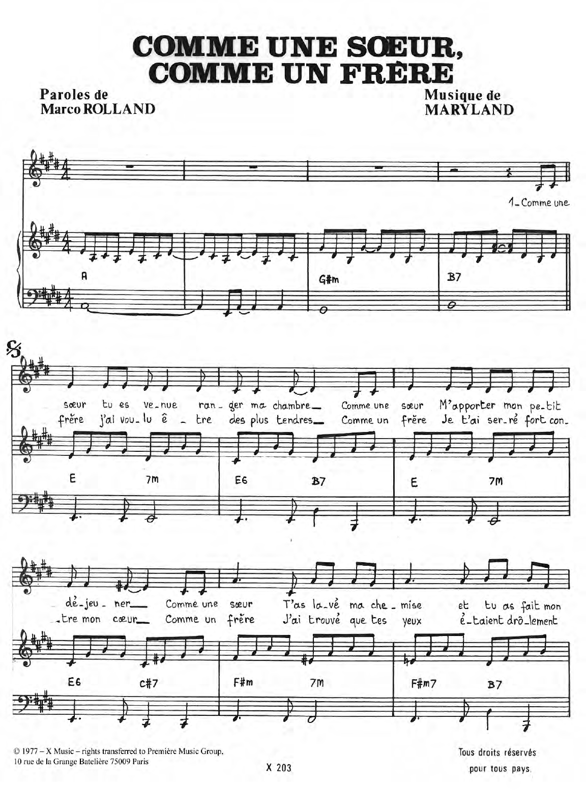 Download or print Maryland Comme Une Soeur Comme Un Frere sheet music, chords and digital score arranged for Piano & Vocal. This Pop score includes 3 page(s).