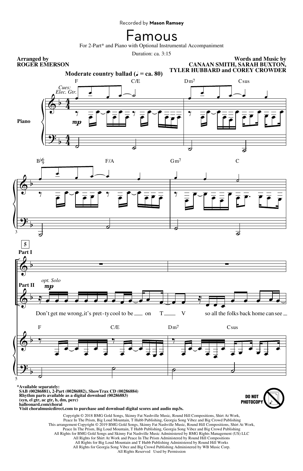 Download or print Mason Ramsey Famous (arr. Roger Emerson) sheet music, chords and digital score arranged for SAB Choir. This Concert score includes 9 page(s).