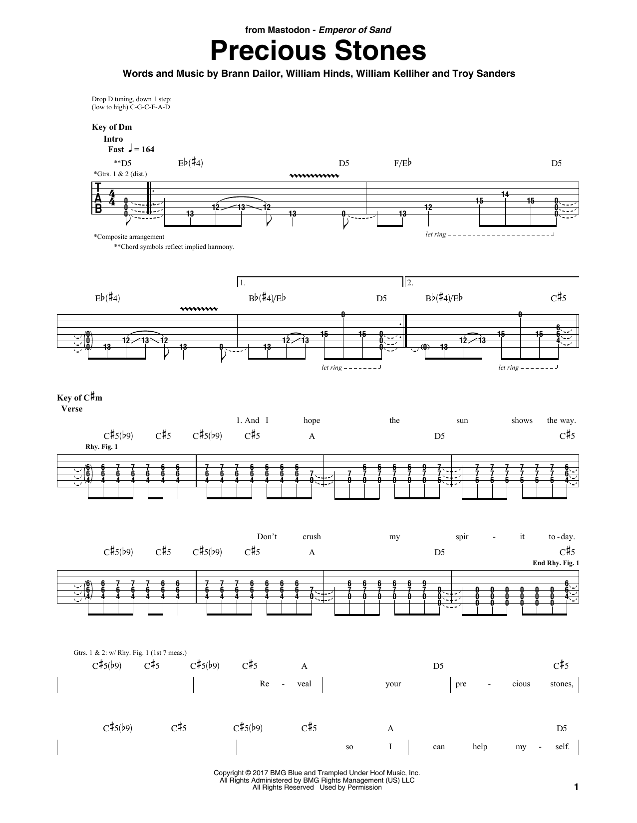 Download or print Mastodon Precious Stones sheet music, chords and digital score arranged for Guitar Rhythm Tab. This Metal score includes 8 page(s).