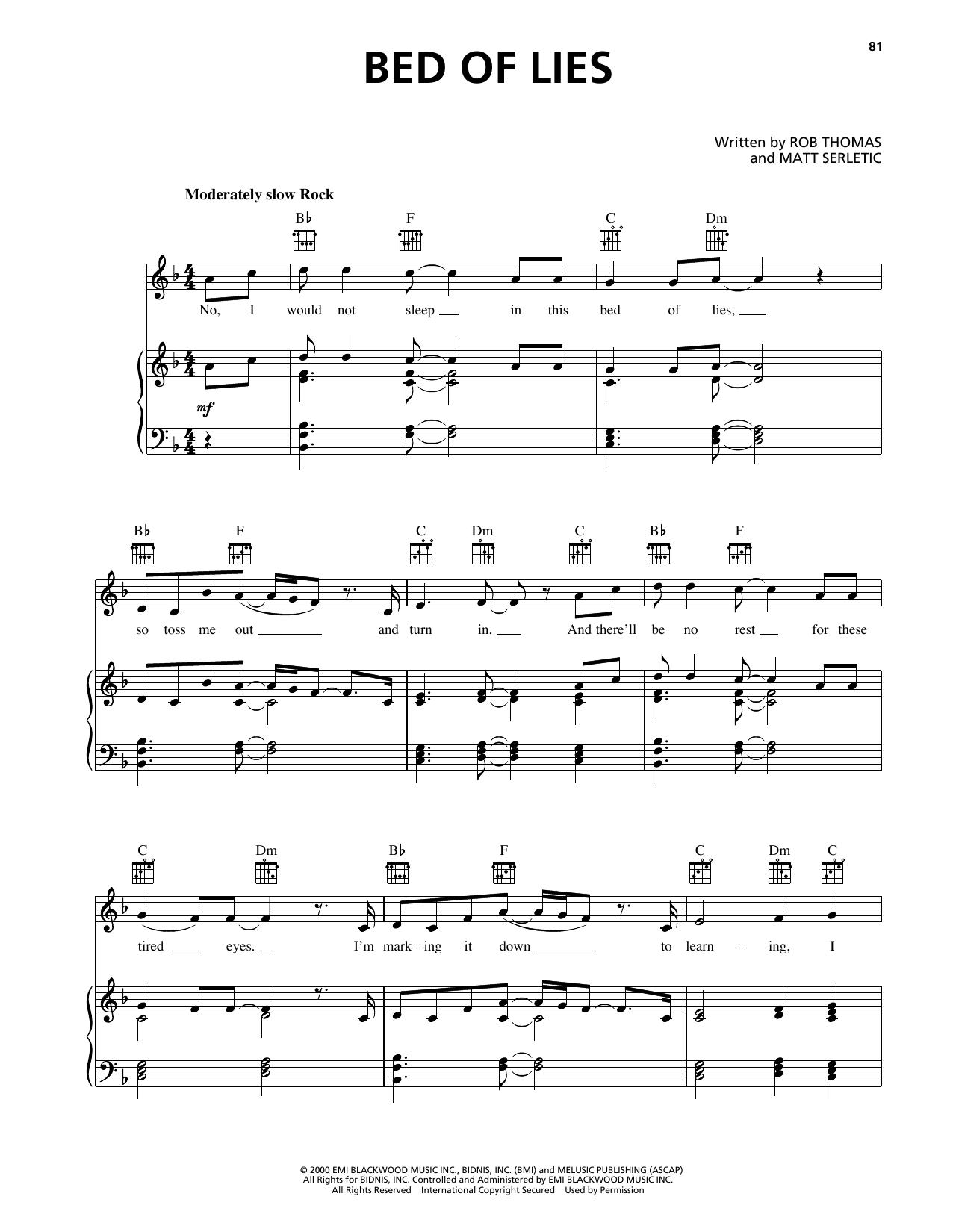 Download or print Matchbox Twenty Bed Of Lies sheet music, chords and digital score arranged for Piano, Vocal & Guitar Chords (Right-Hand Melody). This Pop score includes 7 page(s).