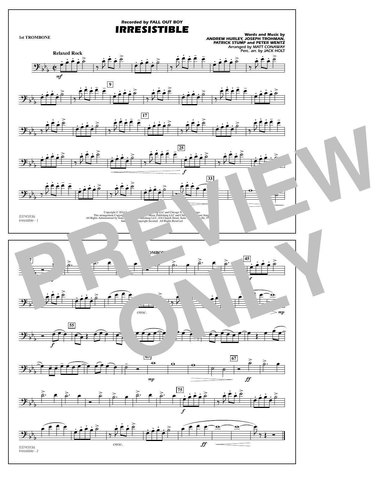 Download or print Matt Conaway Irresistible - 1st Trombone sheet music, chords and digital score arranged for Marching Band. This Pop score includes 1 page(s).