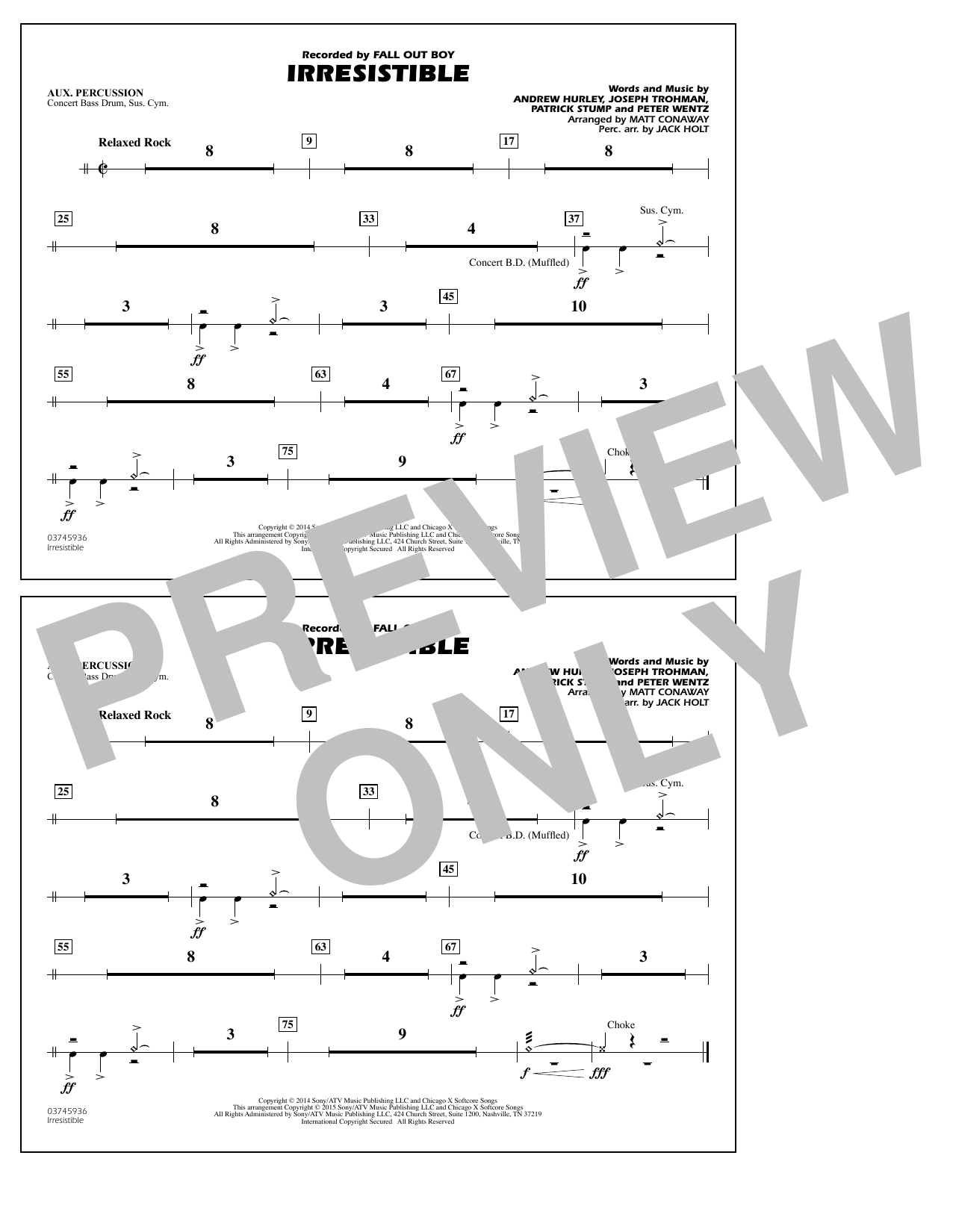 Download or print Matt Conaway Irresistible - Aux Percussion sheet music, chords and digital score arranged for Marching Band. This Pop score includes 1 page(s).