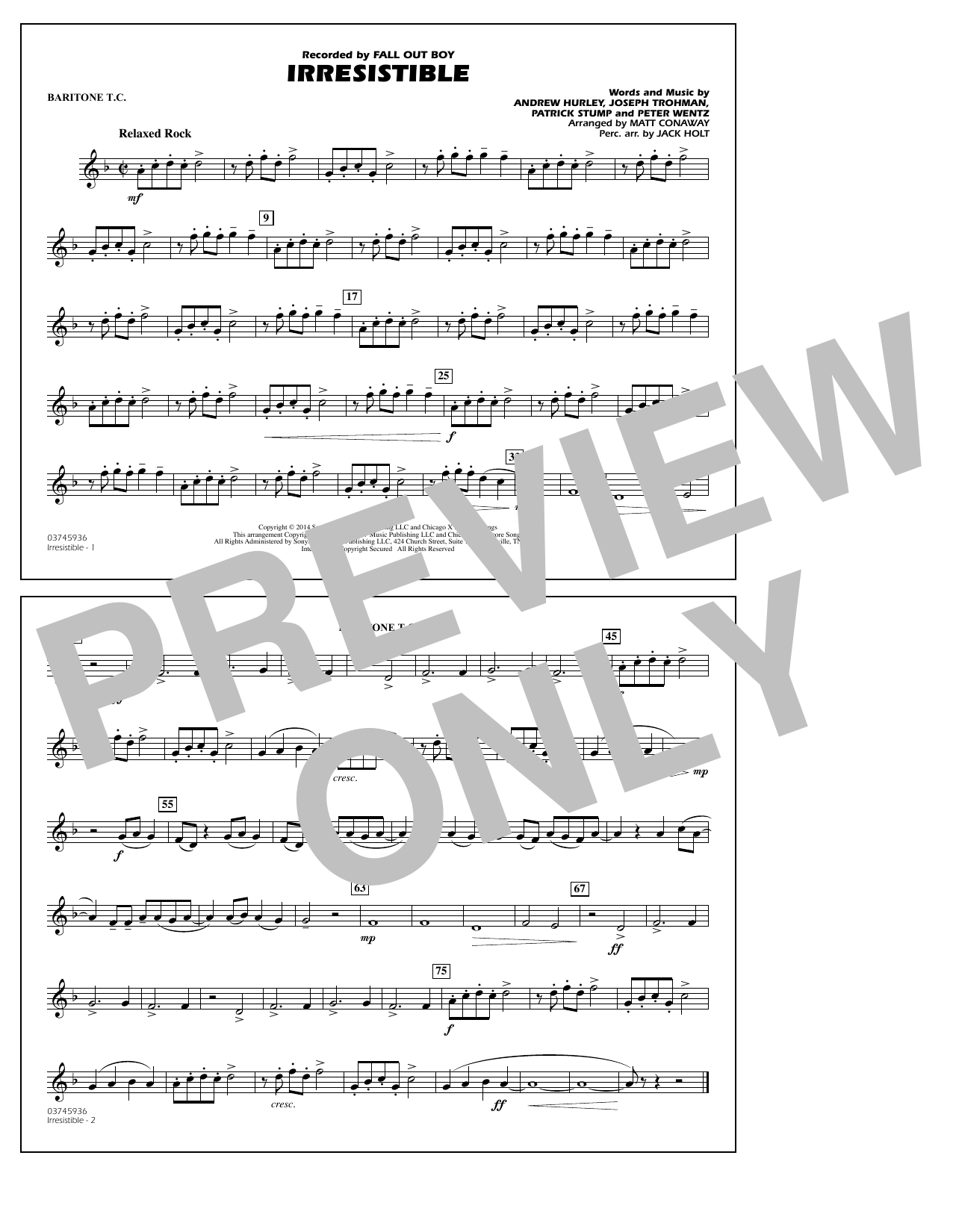 Download or print Matt Conaway Irresistible - Baritone T.C. sheet music, chords and digital score arranged for Marching Band. This Pop score includes 1 page(s).