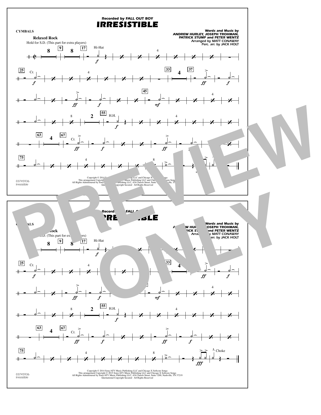 Download or print Matt Conaway Irresistible - Cymbals sheet music, chords and digital score arranged for Marching Band. This Pop score includes 1 page(s).
