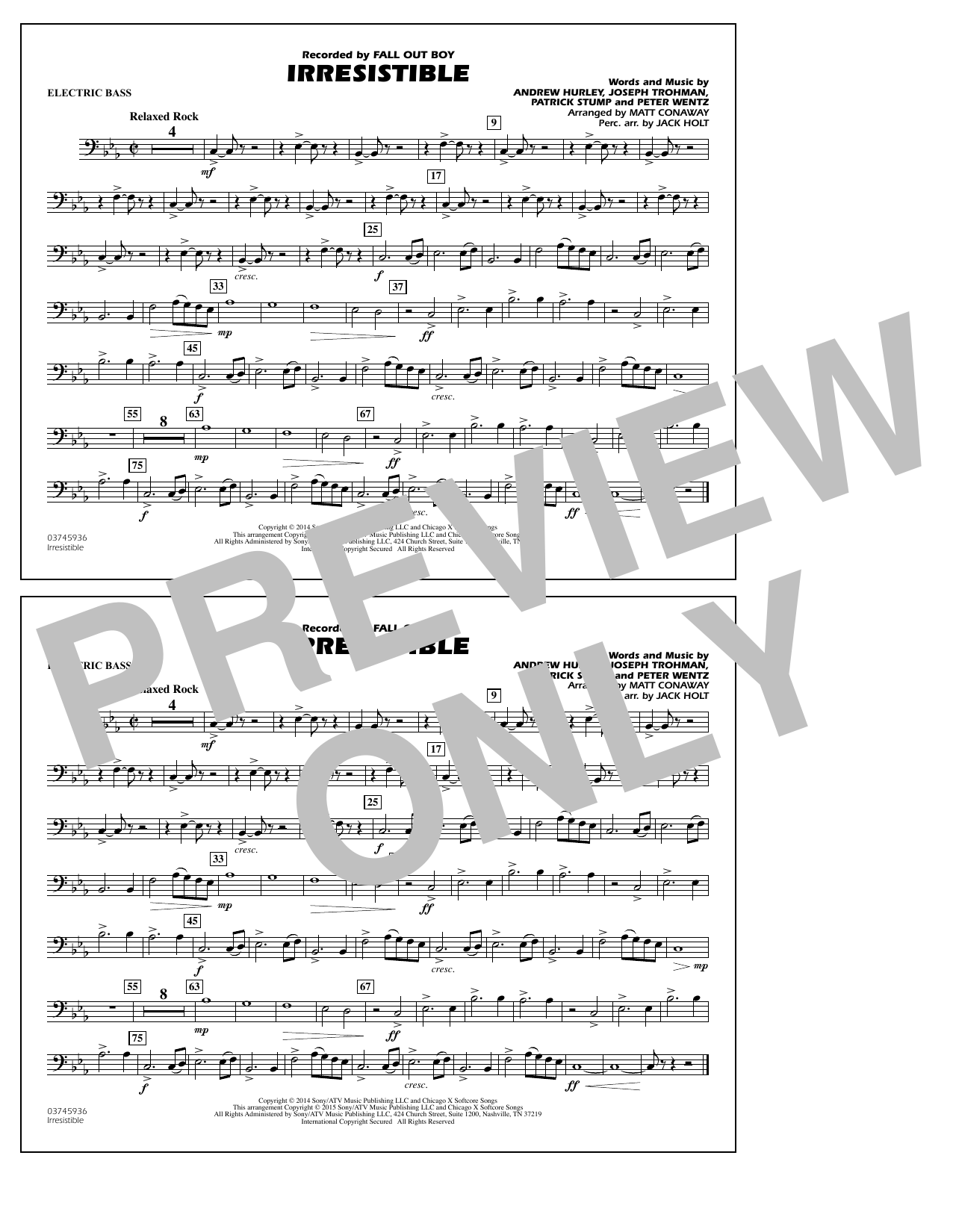 Download or print Matt Conaway Irresistible - Electric Bass sheet music, chords and digital score arranged for Marching Band. This Pop score includes 1 page(s).