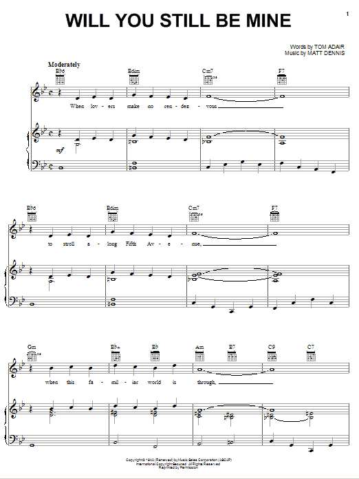 Download or print Matt Dennis Will You Still Be Mine sheet music, chords and digital score arranged for Piano, Vocal & Guitar Chords (Right-Hand Melody). This Jazz score includes 4 page(s).