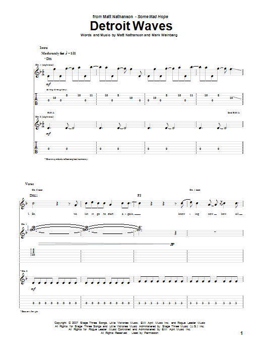 Download or print Matt Nathanson Detroit Waves sheet music, chords and digital score arranged for Guitar Tab. This Pop score includes 11 page(s).