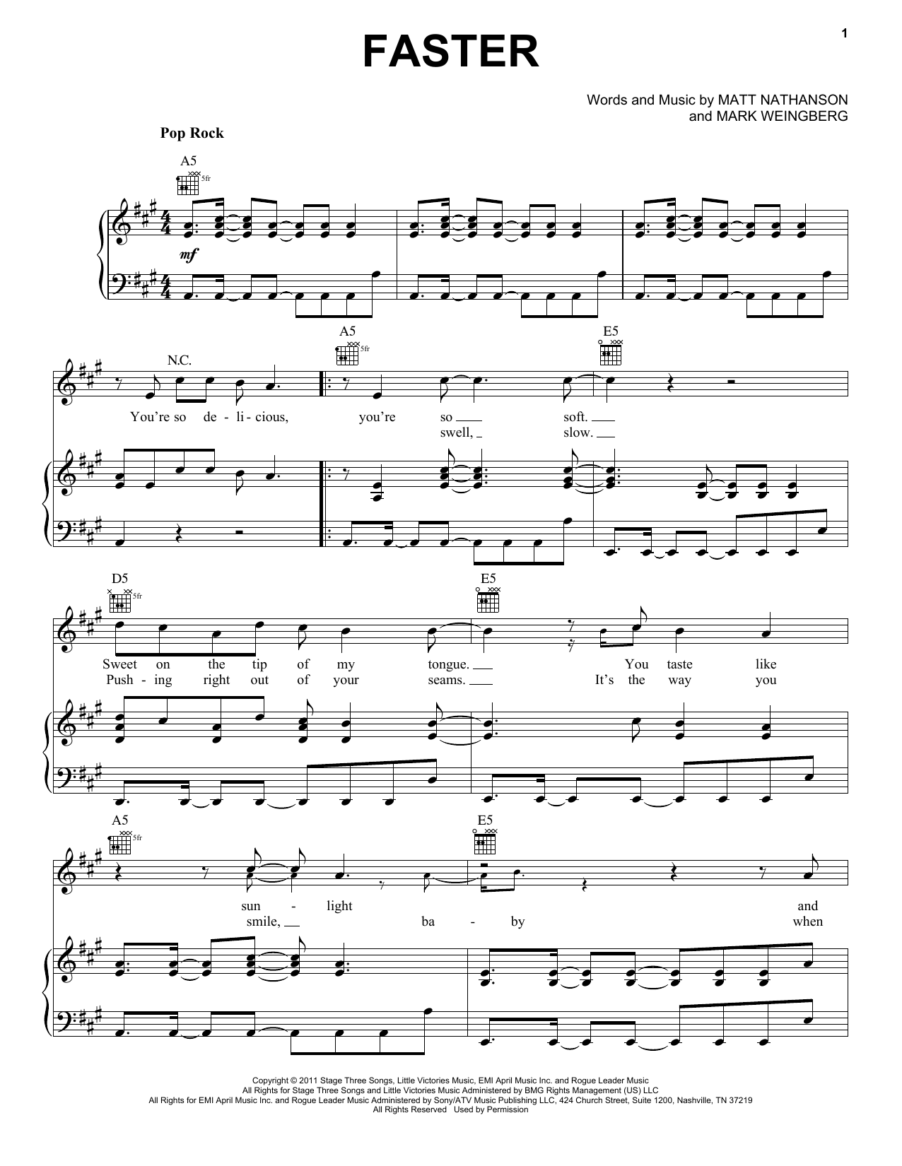 Download or print Matt Nathanson Faster sheet music, chords and digital score arranged for Piano, Vocal & Guitar Chords (Right-Hand Melody). This Pop score includes 7 page(s).