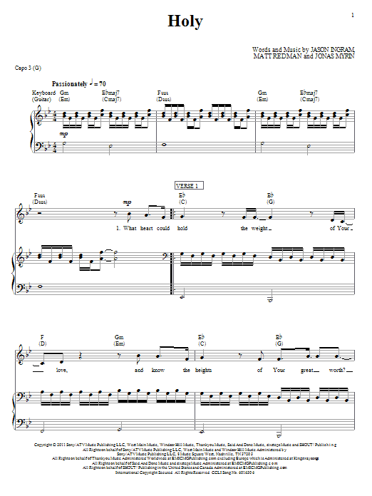 Download or print Matt Redman Holy sheet music, chords and digital score arranged for Piano, Vocal & Guitar Chords (Right-Hand Melody). This Pop score includes 10 page(s).