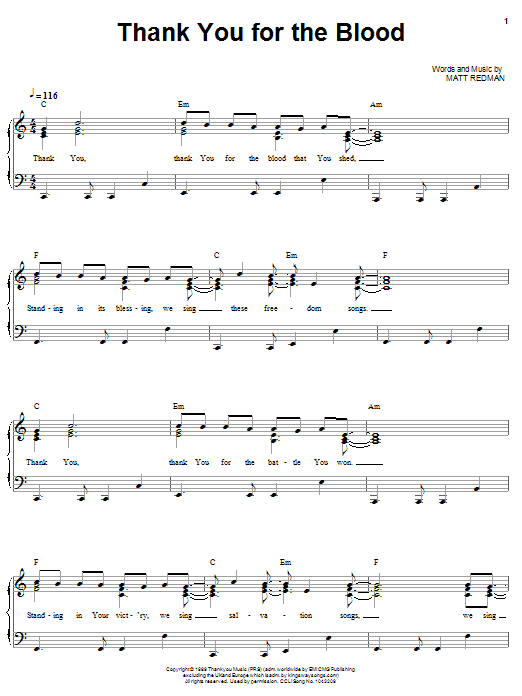 Download or print Matt Redman Thank You For The Blood sheet music, chords and digital score arranged for Piano, Vocal & Guitar Chords (Right-Hand Melody). This Christian score includes 3 page(s).