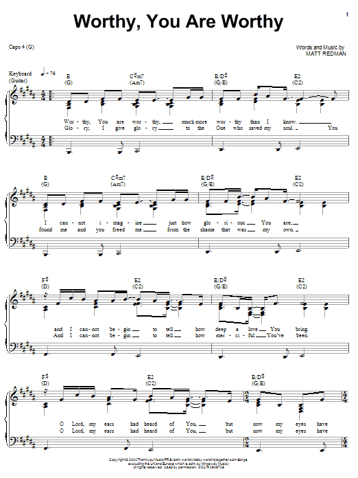 Download or print Matt Redman Worthy, You Are Worthy sheet music, chords and digital score arranged for Piano, Vocal & Guitar Chords (Right-Hand Melody). This Christian score includes 5 page(s).