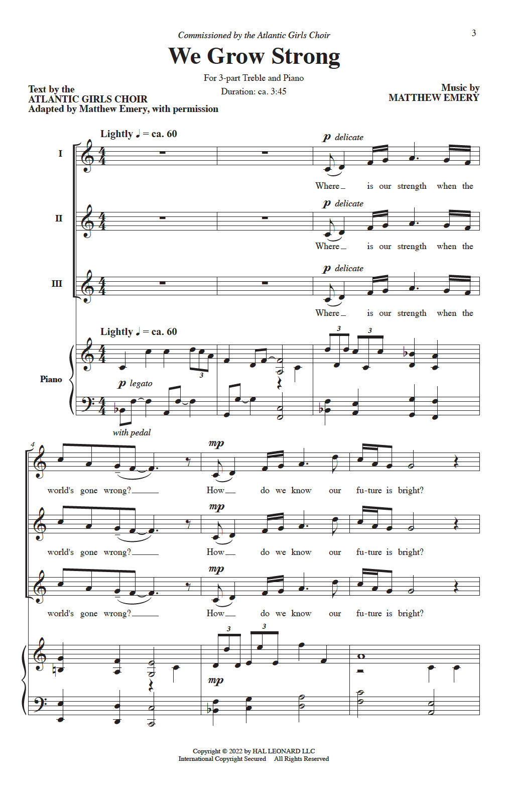 Download or print Matthew Emery We Grow Strong sheet music, chords and digital score arranged for 3-Part Mixed Choir. This Contemporary score includes 11 page(s).