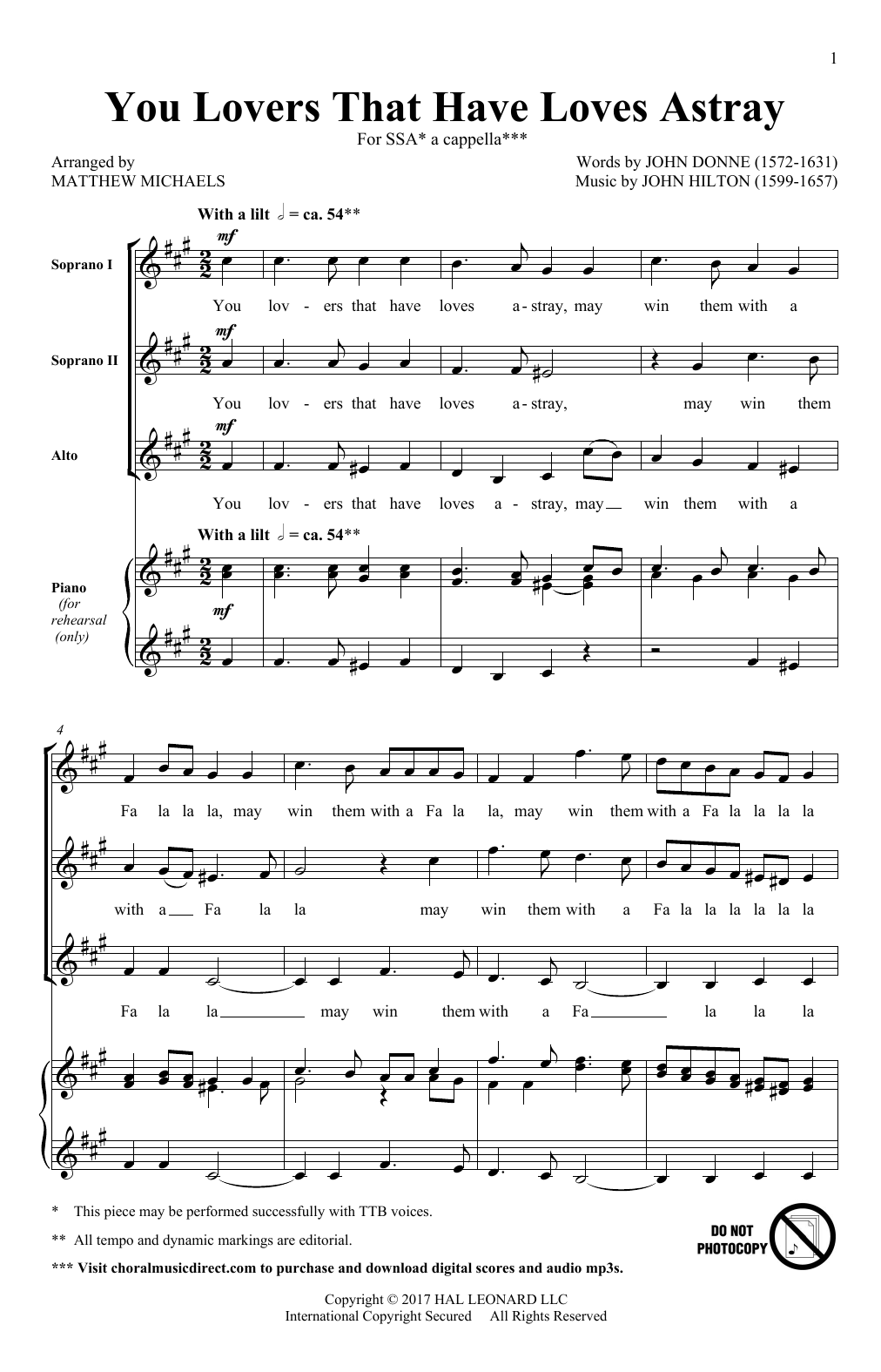 Download or print Matthew Michaels You Lovers That Have Loves Astray sheet music, chords and digital score arranged for SSA Choir. This Concert score includes 6 page(s).