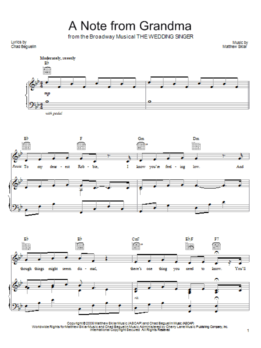 Download or print Matthew Sklar A Note From Grandma sheet music, chords and digital score arranged for Piano, Vocal & Guitar Chords (Right-Hand Melody). This Musical/Show score includes 2 page(s).